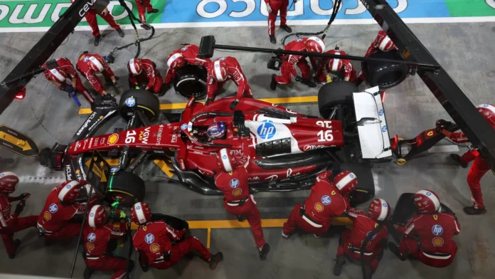 The pit window was wide: the top three of Charles Leclerc, Carlos Sainz and Verstappen stopped on Laps 26, 21, 25 respectively; behind them the McLarens of Lando Norris and Oscar Piastri went longer, to Laps 31 and 32.